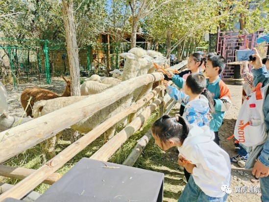 参观基地动物园,给羊驼喂胡萝卜。