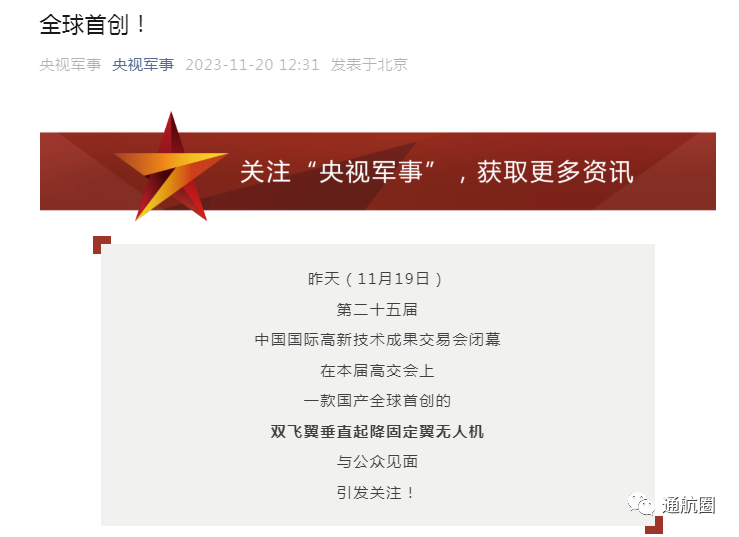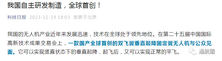 11月19日,科技日报、央视新闻、央视军事等多家权威媒体报道,在第二十五届中国国际高新技术成果交易会上,一款国产全球首创的双飞翼垂直起降固定翼无人机与公众见面。它可以实现竖直状态下的垂直起降,起飞后,又可以实现正常的平飞。据介绍,这款新型无人机由中国科学院长春光机所科研人员自主研发制造,采用全球首创的双飞翼+多旋翼的气动布局,科研团队掌握了从驱动系统、传感器数据融合、飞控系统及算法等全技术链路,创新性地实现无人机在零下40℃、海拔5500米,以及在7级强风中正常起降飞行的多项无人机性能极限。